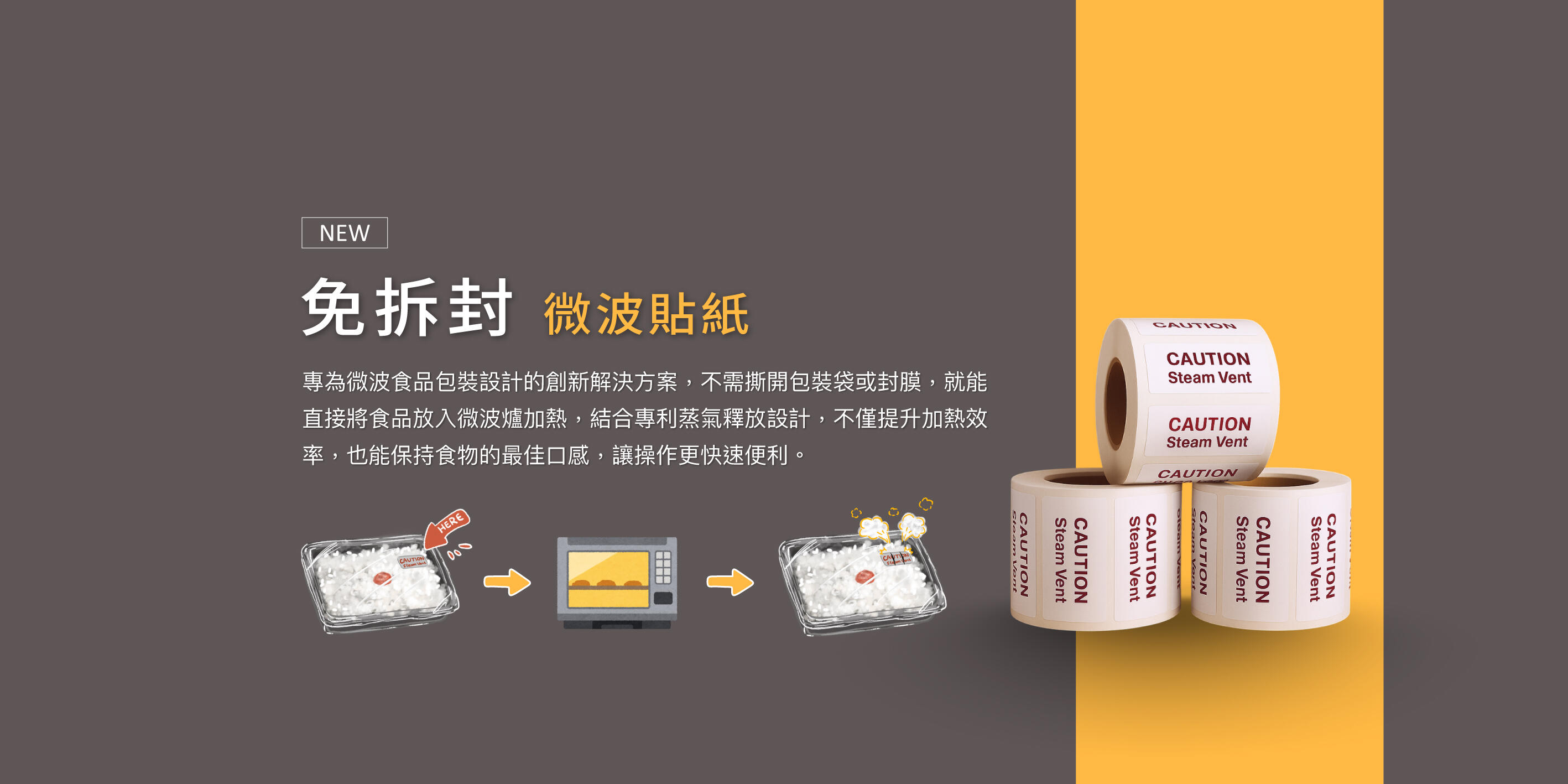 專為微波食品設計,無需拆封即可直接加熱,操作更快速便利,採用食品級耐熱材質與專利蒸氣釋放設計,可縮短加熱時間,適用於便利商店餐盒、外送餐飲、冷凍冷藏食品與中央廚房。